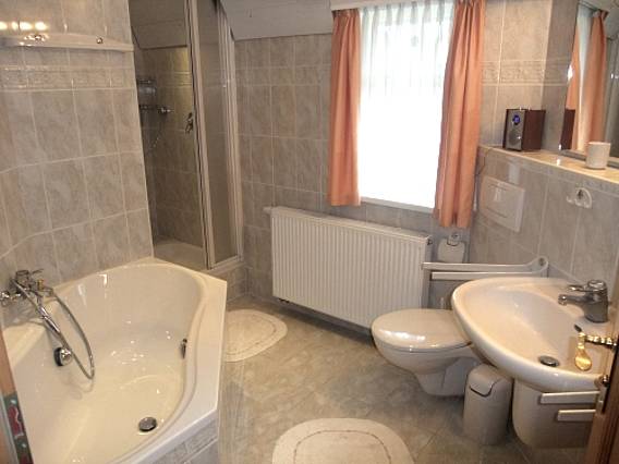 Das Obergeschoss ist aufgeteilt in 3 Schlafräume, ein kleines Bad mit Dusche/Waschtisch/ WC und ein großes Bad mit Wanne/Dusche/Waschtisch/WC. Die Möblierung ist dem Stil des Hauses angepasst. Die Aussstattung ist reichhaltig und lässt kaum Wünsche offen.