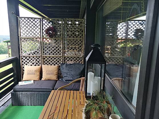 Von der Loggia mit Balkonmöbeln und Hängematte geht der Blick ins Grüne.