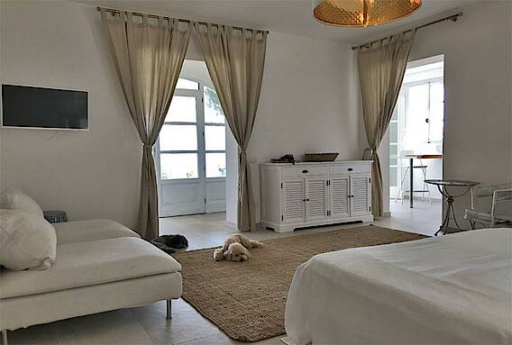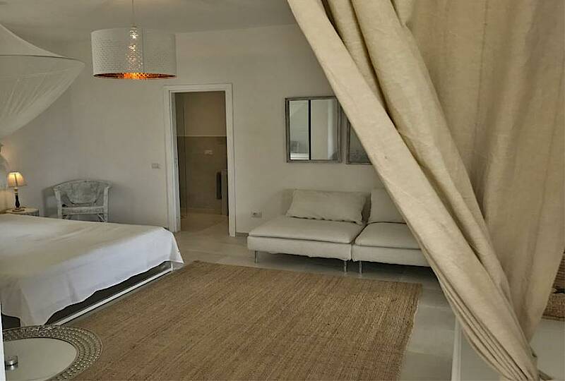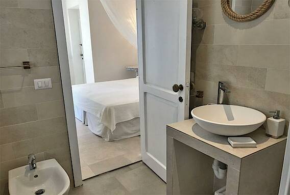 liegt im unteren Bereich der Villa. Durch eine grosse Glasfront gelangt man in den Wohn- und Schlafraum mit Badezimmer. Von dort gelangt man in eine geraeumige Kueche mit Zugang zur Speiseterrasse und in einen weiteren Schlafraum auch mit eigenem Badezimmer und Zugang in den Garten.