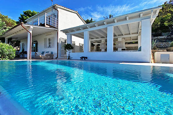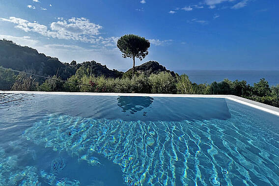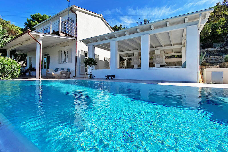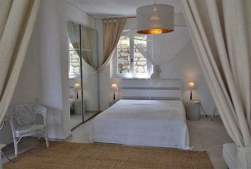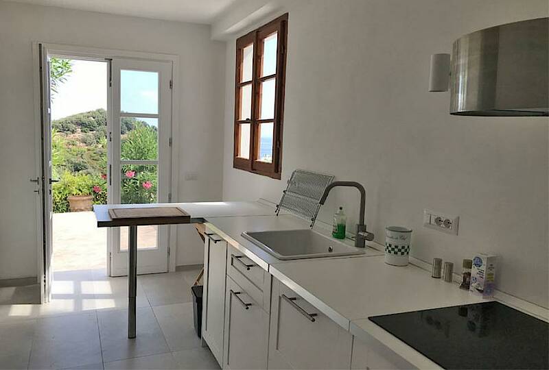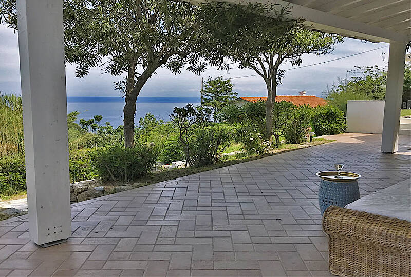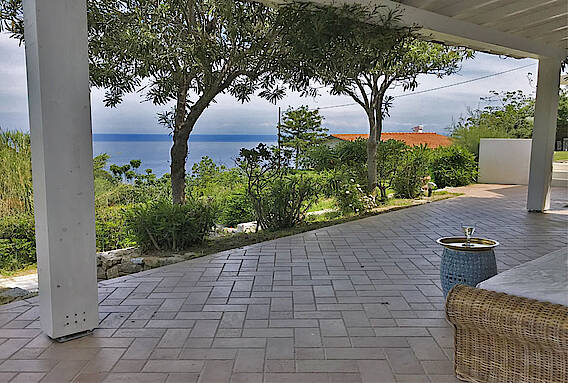 ist eine reizvolle Villa mit grossem Garten und schoenem Meerblick. Ein 50 m langer Fussweg von der Hauptstrasse (Sackgasse zum Strand) zur Villa garantiert die ruhige Lage des Anwesens. Der Weg zum Strand beträgt circa 5 Minuten zu Fuss und geht über die antiken Treppen des Dorfes bergab.