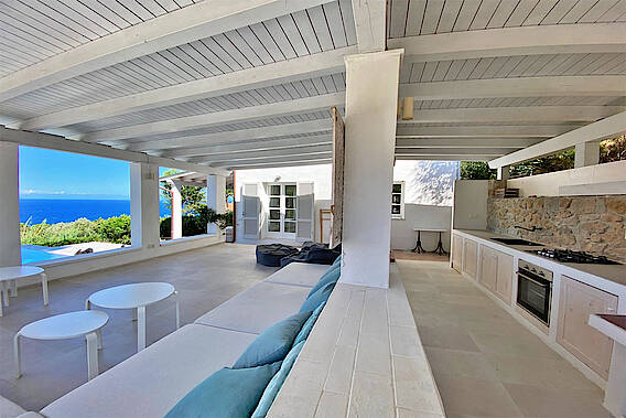 Vor der Wohnung befindet sich ein grosse Terrasse mit Meerblick und neben der Wohnung ein sehr grosse Loggia mit Lounge und Speiseberiech sowie einer offenen Kueche mit Ofen, Herd und Barbeque, alles in exklusiver Nutzung.