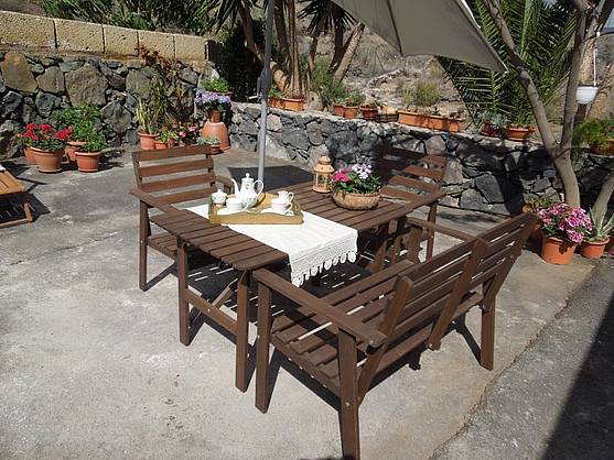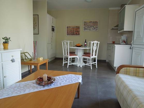 Das Schlafzimmer verfügt über ein Doppelbett, eine weitere Schlafgelegenheit gibt es für eine dritte und eventuell eine vierte Person auf dem ausziehbaren Schlafsofa (1,50 x 1,90 m). Die Mahlzeiten können Sie sowohl im Essbereich in der Küche genießen, wie auch auf der von vielen Pflanzen und Palmen umgebenen Terrasse.