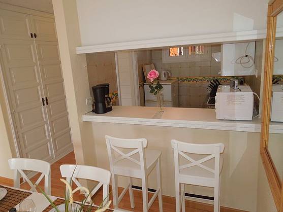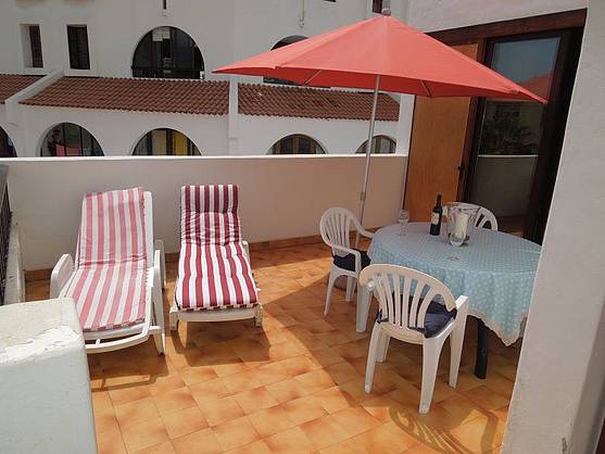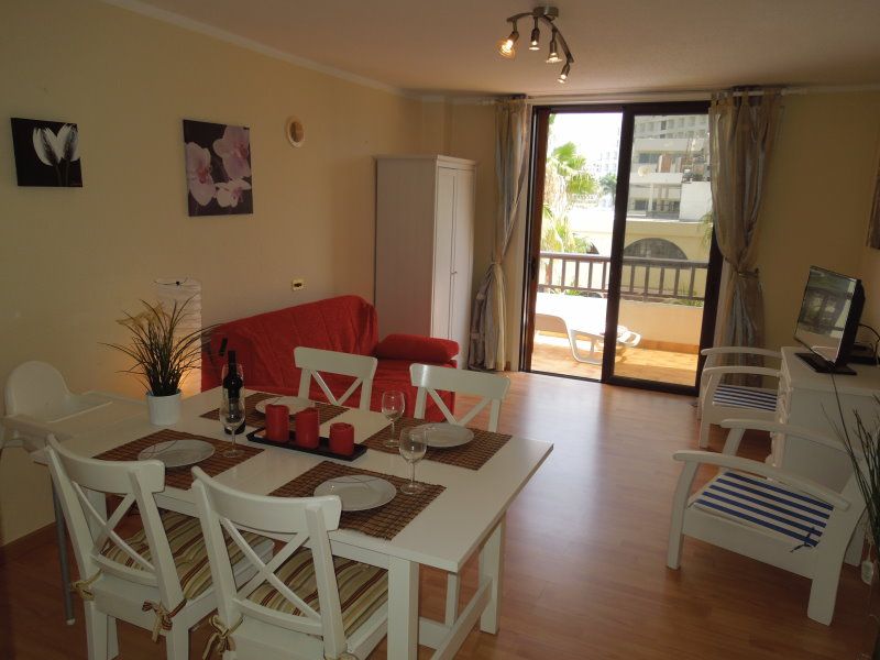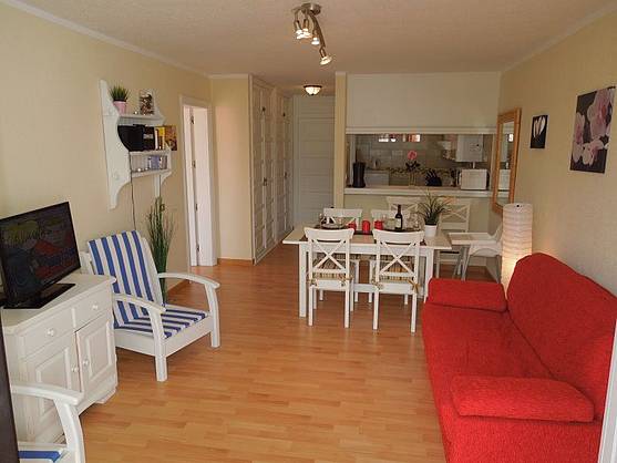 Alle Geschäfte, Restaurants, Friseursalons, Banken und Geldautomaten können bequem zu Fuß erreicht werden. Das Apartment hat ein separates Schlafzimmer mit Doppelbett und ein modernes Wohnzimmer. Das Highlight ist die große Eckterrasse mit Sitzmöbeln und Sonnenliegen, von der man einen wunderschönen Blick zum Teide und zum Strand hat. Der gemütliche Wohnbereich ist mit hellem Laminat ausgestattet. Im Wohnzimmer gibt es einen Flachbild-Fernseher mit Satellitenprogrammen und eine kleine Stereoanlage. Das komfortable Sofa läßt sich mit wenigen Handgriffen zum Schlafsofa umbauen.