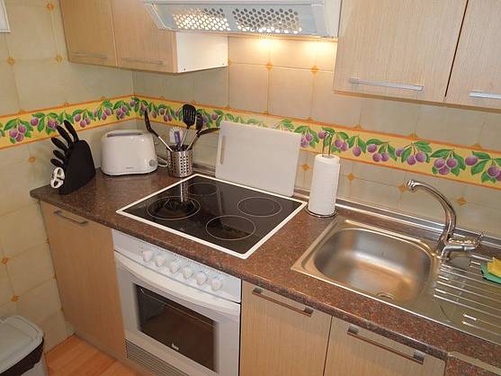 Küchenzeile, Kühlschrank, Mikrowelle, Backofen, Waschmaschine, Bügelbrett, Bügeleisen, Kaffeemaschine, Toaster |