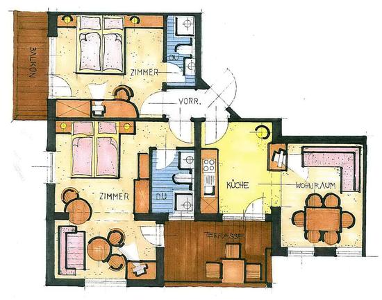 Ferienwohnungen für 4-6 Personen, ca. 75m² bestehend aus 2 getrennten Schlafzimmern (1 Vierbett- u. 1 Doppelzimmer) mit jeweils eigener Dusche/WC, Fön, LCD-Flachbild-SAT-TV mit Radio, Zimmersafe, W-LAN-Anschluß und Balkon.
