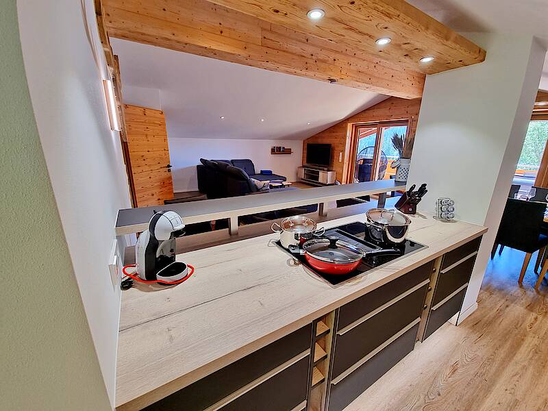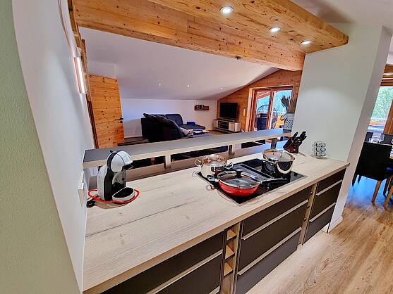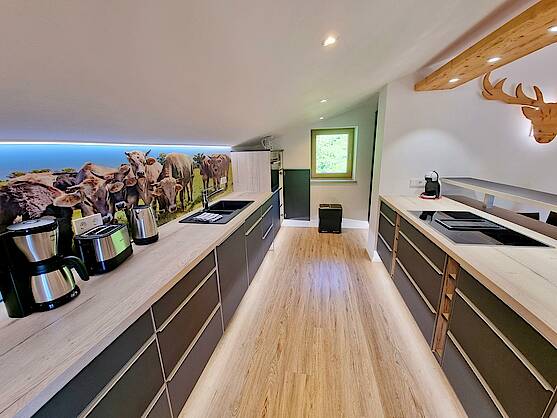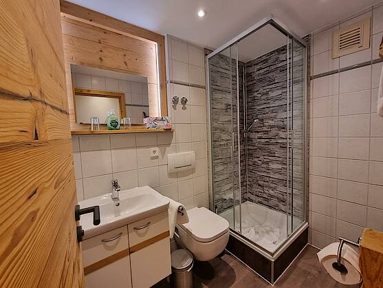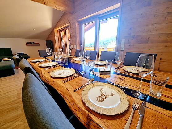 Unsere luxuriöse Wellnesssuite "Heimatgefühl" (160 m²) bietet ausreichend Platz für Familie und Freunde. Die 3 Doppelzimmer verfügen über ein eigenes Badezimmer mit DU/WC, in dem jeder jeder Gast seine eigene Privatsphäre hat. Im Obergeschoss befindet sich der Aufenthaltsbereich mit der riesigen Wohnlandschaft, der offenen, vollausgestatteten Küche (inkl. Kühl- und Gefrierschrank, Mikrowelle, Backofen und Geschirrspüler) und dem großen Esstisch für 10 Personen. Hier sind gesellige Stunden garantiert. Entspannung finden Sie in Ihrem privaten Wellnessbereich. Dieser ist mit Sauna, Erlebnisdusche und Whirlwanne ausgestattet. Vergessen Sie allen Alltagsstress beim Blick in die Tiroler Berglandschaft von Ihrem ruhigen Balkon aus.