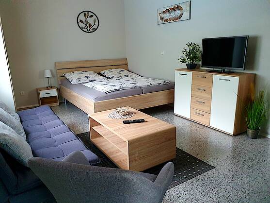 Das Ferienhaus ist vom Deutschen Tourismusverband mit *** Sternen ausgezeichnet. Es hat ein großes, geschmackvoll eingerichtetes Wohn-/Schlafzimmer mit Essecke, Sofa, Sessel u. . .
